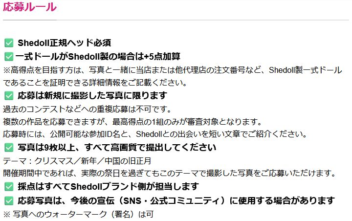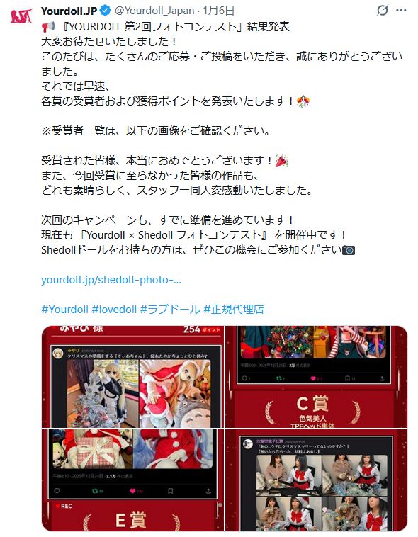 撮影した写真を公開し、@Yourdoll_Japan をメンションのうえ、ハッシュタグ「#YourdollxShedollフォトコン」を付けて投稿してください。